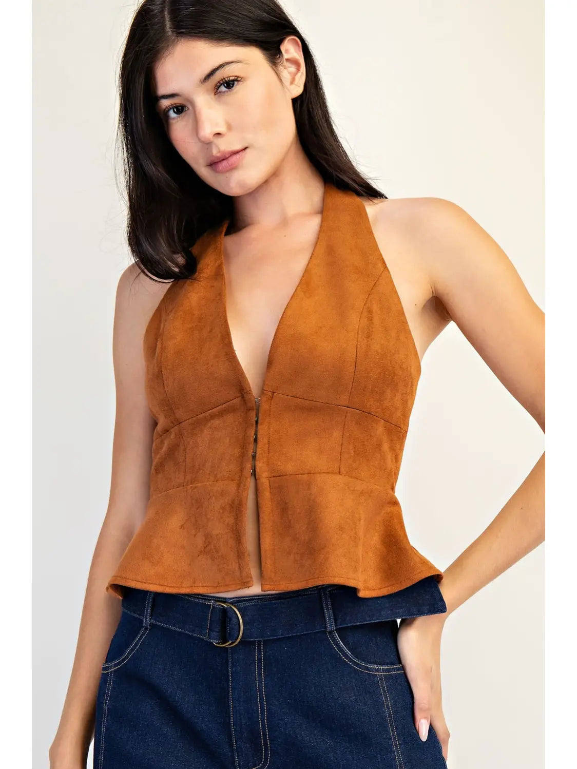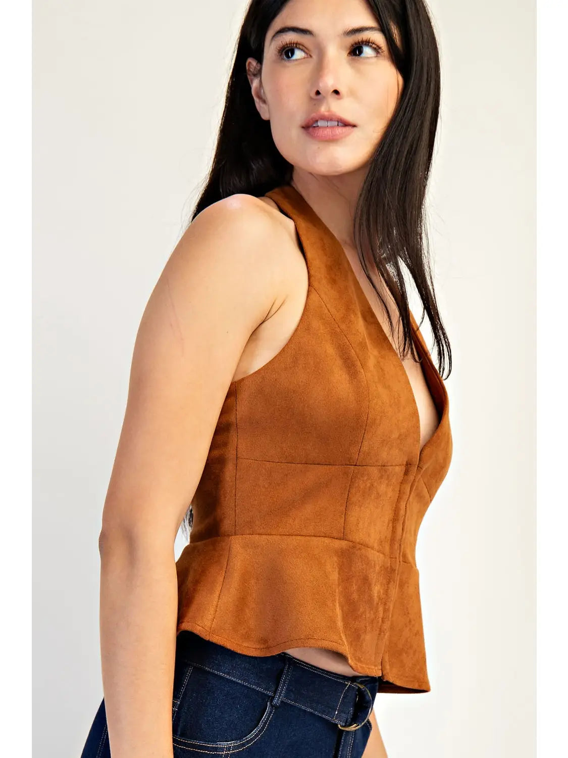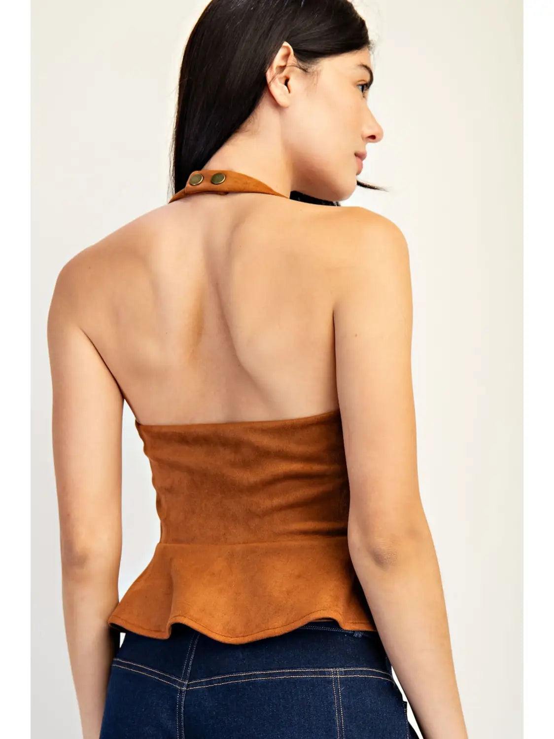 This faux suede halter top delivers a refined, modern edge with a soft, tactile finish. Designed with a deep V-neckline and a fitted bodice that flares into a subtle peplum hem, it enhances the waistline while maintaining a sleek silhouette. The open back with snap-neck closure adds a bold, feminine touch, making it perfect for transitional dressing from day to night. Crafted from supple faux suede with structured seaming, this piece offers both comfort and style in equal measure. - Faux suede fabric with structured seaming - Halter neckline with snap closure at the neck - Fitted waist with soft peplum hem - Deep V-front for a modern, elevated shape - Open back design with clean finish Tags: Suede Tops, Halter Tops, Peplum Tops, Sleeveless Tops, Dressy Tops