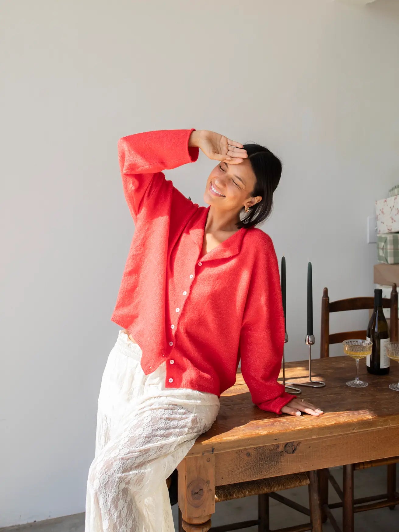 Soft and cozy lightweight cardigan with rolled edge finish on the sleeves and collar.
