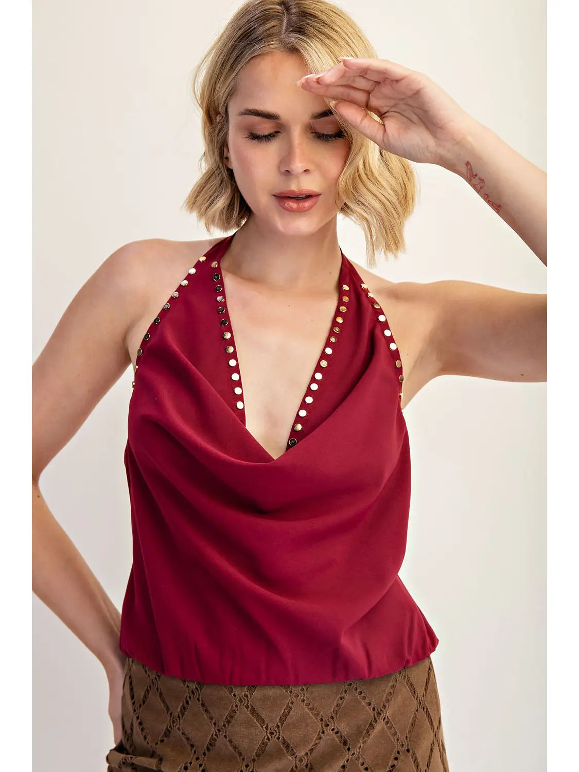 Elevate your night-out wardrobe with this edgy Studded Cowl Neck Halter Top. Designed with a plunging cowl neckline trimmed in metallic studs, this top adds a bold statement to any outfit. The backless silhouette and adjustable tie-neck closure provide a sleek, flattering fit. Perfect for club nights or statement layering. - Sleeveless Top - Plunging Cowl Neck - Studded - Halter Tie Back - Open Back Detail