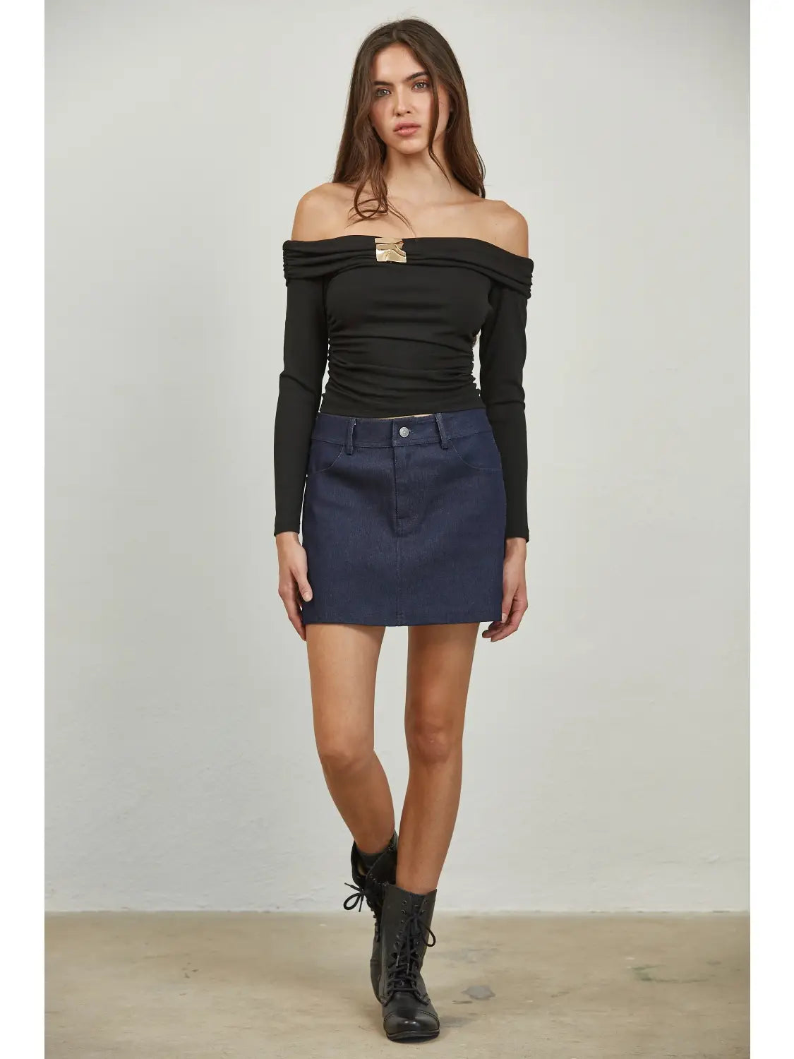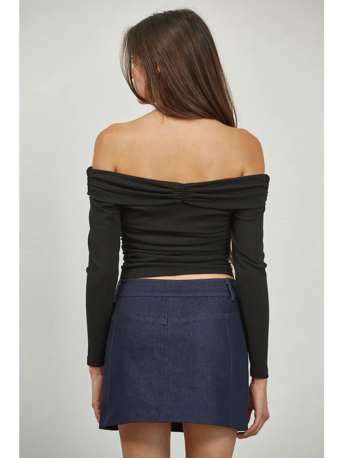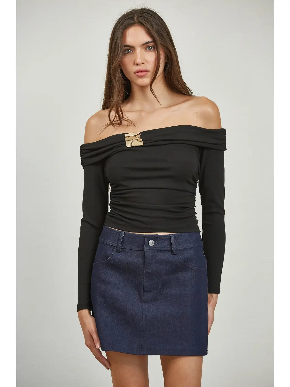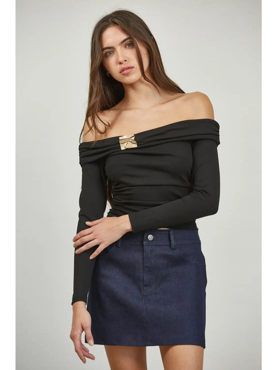 This off-shoulder top blends sleek sophistication with a touch of modern glamour, designed for both evening wear and elevated day looks. Crafted with a flattering ruched bodice, it features a fold-over neckline accented by a statement metallic detail at the front, adding a chic focal point. The fitted silhouette elongates the figure, while the long sleeves balance the cropped hemline for a contemporary finish. Perfect for pairing with skirts, trousers, or layered pieces, this versatile top is a must-have for wardrobes that value timeless design with a fashion-forward edge