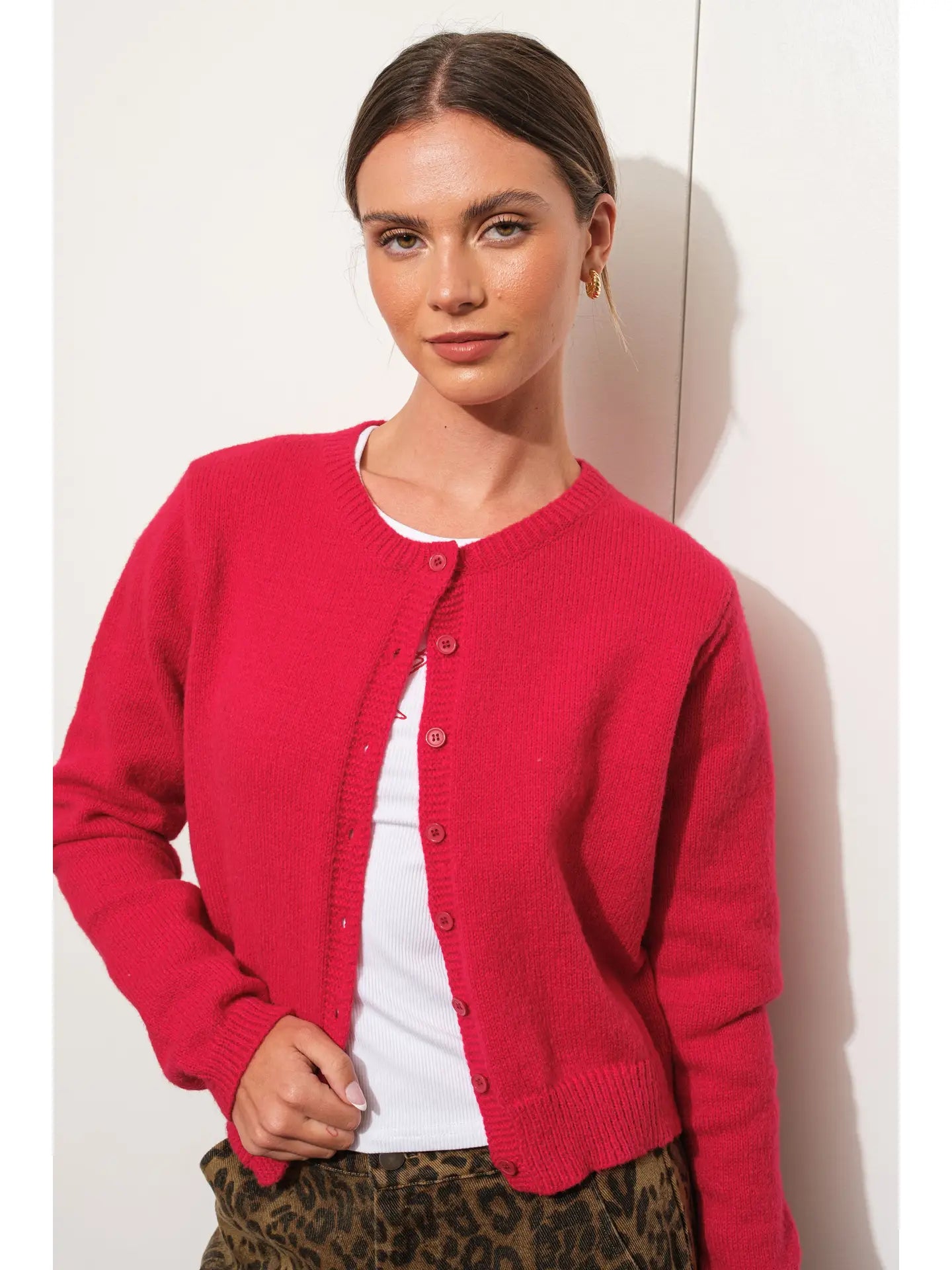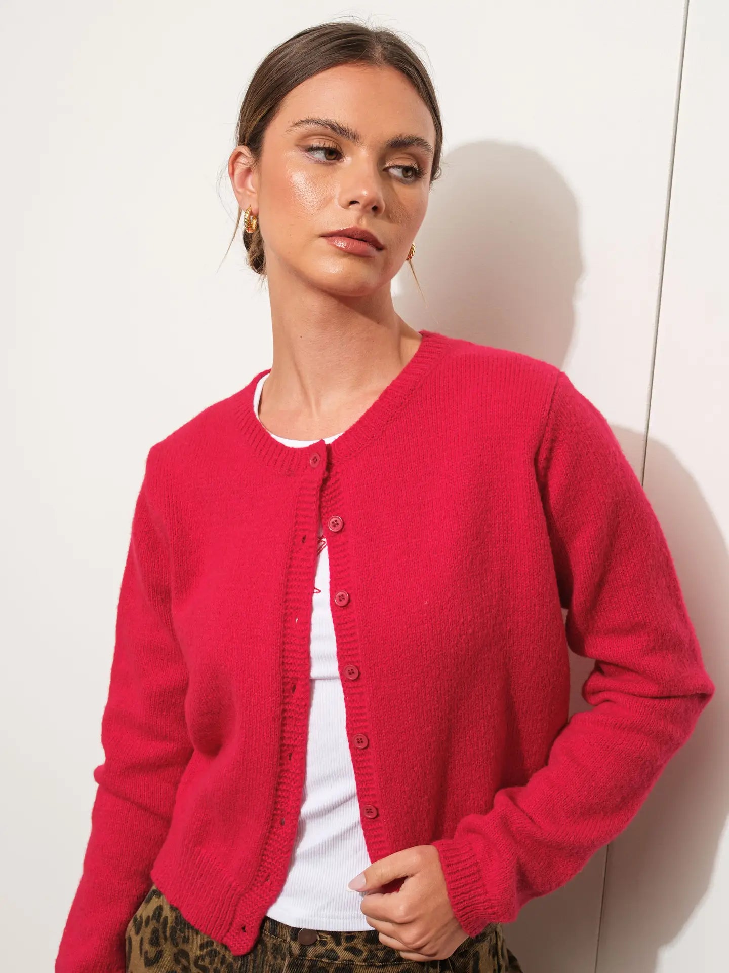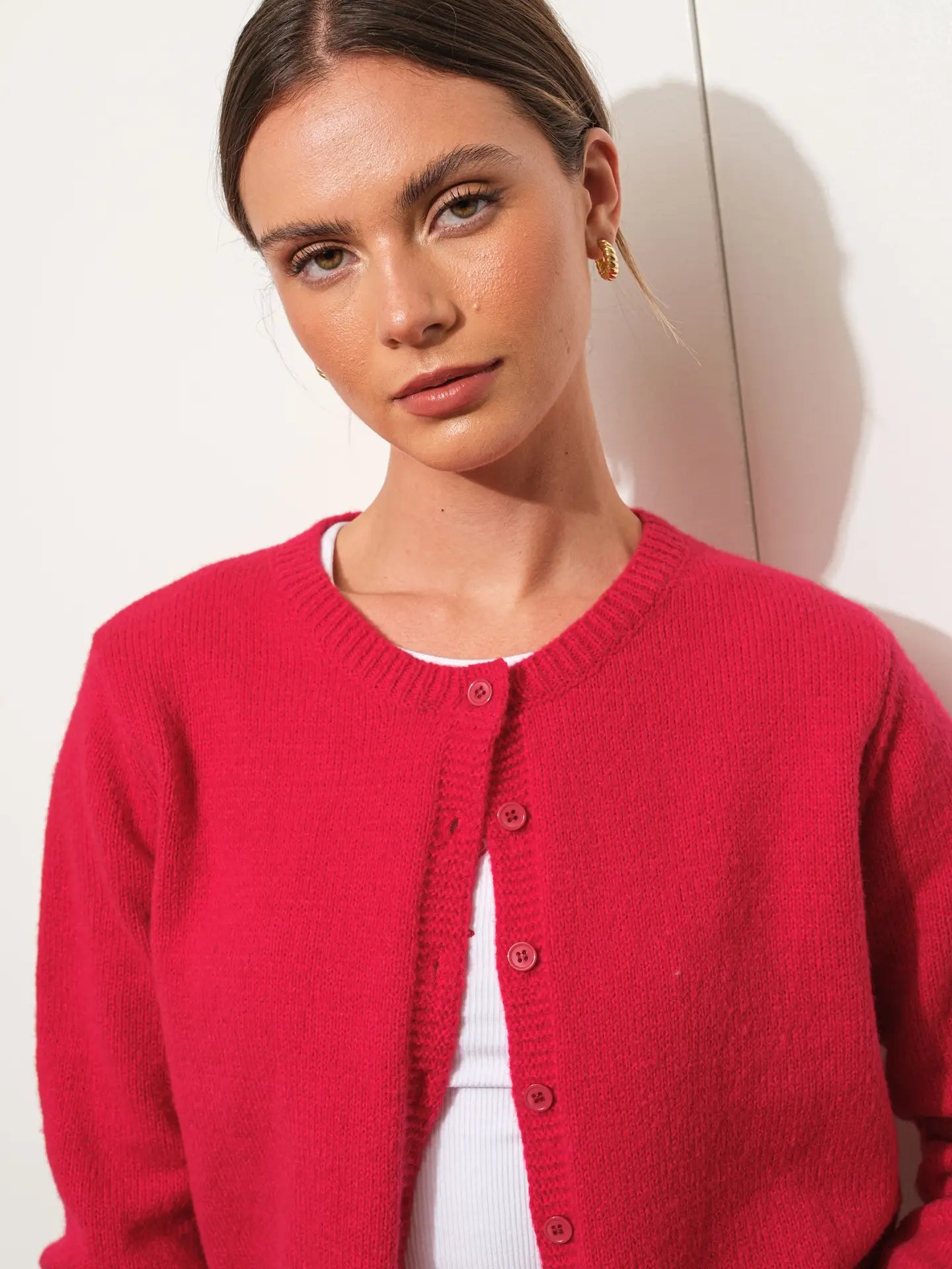 Step into effortless style with the Basic Cardigan—a timeless piece designed for comfort and versatility. The button front closure and hip length make it perfect for layering over any outfit. Shown here in a bold red colorway and styled with PSP1334 for a chic, boutique look. - Basic knit cardigan for classic, everyday comfort - Button front closure for easy styling - Hip length for a flattering silhouette - Red colorway for a pop of color - 100% Polyester