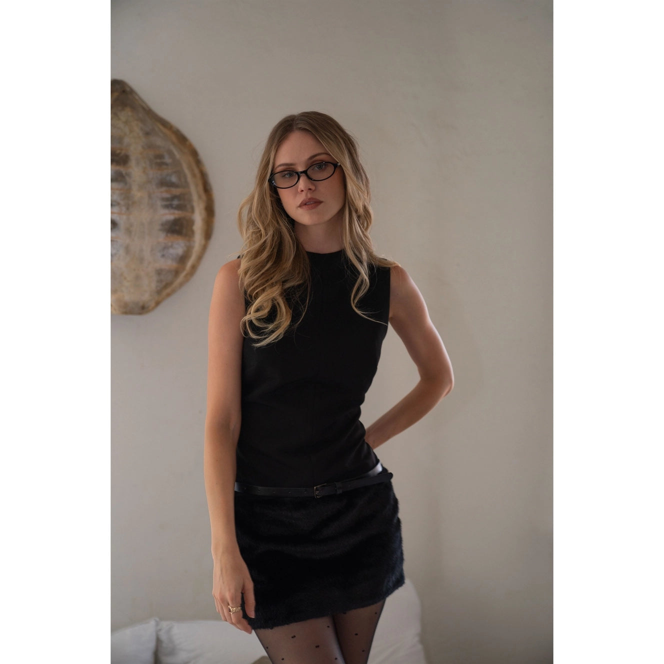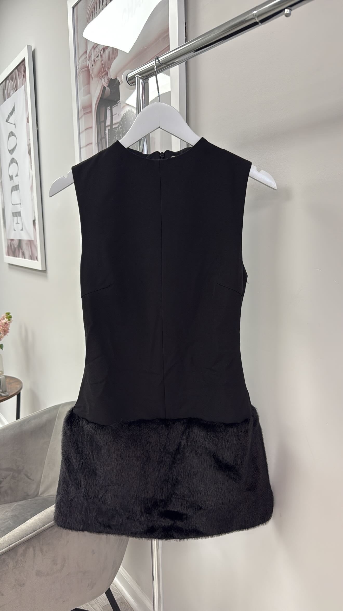 This chic black dress features a plush faux fur skirt, adding bold texture and a touch of sophistication to your look. The sleeveless fitted bodice is complemented by a waist belt that cinches the waist, enhancing your silhouette with elegant definition. A hidden back zipper closure ensures a smooth, secure fit. Perfect for evening events, parties, or special occasions. * Washing Instructions: Hand wash recommended, machine wash available. Do not bleach and iron. * Model is 5'3" and Wearing a Size Small. Self: 90% Acetate Fiber, 10% Spandex Contrast: 100% Polyester Lining: 100% Pol