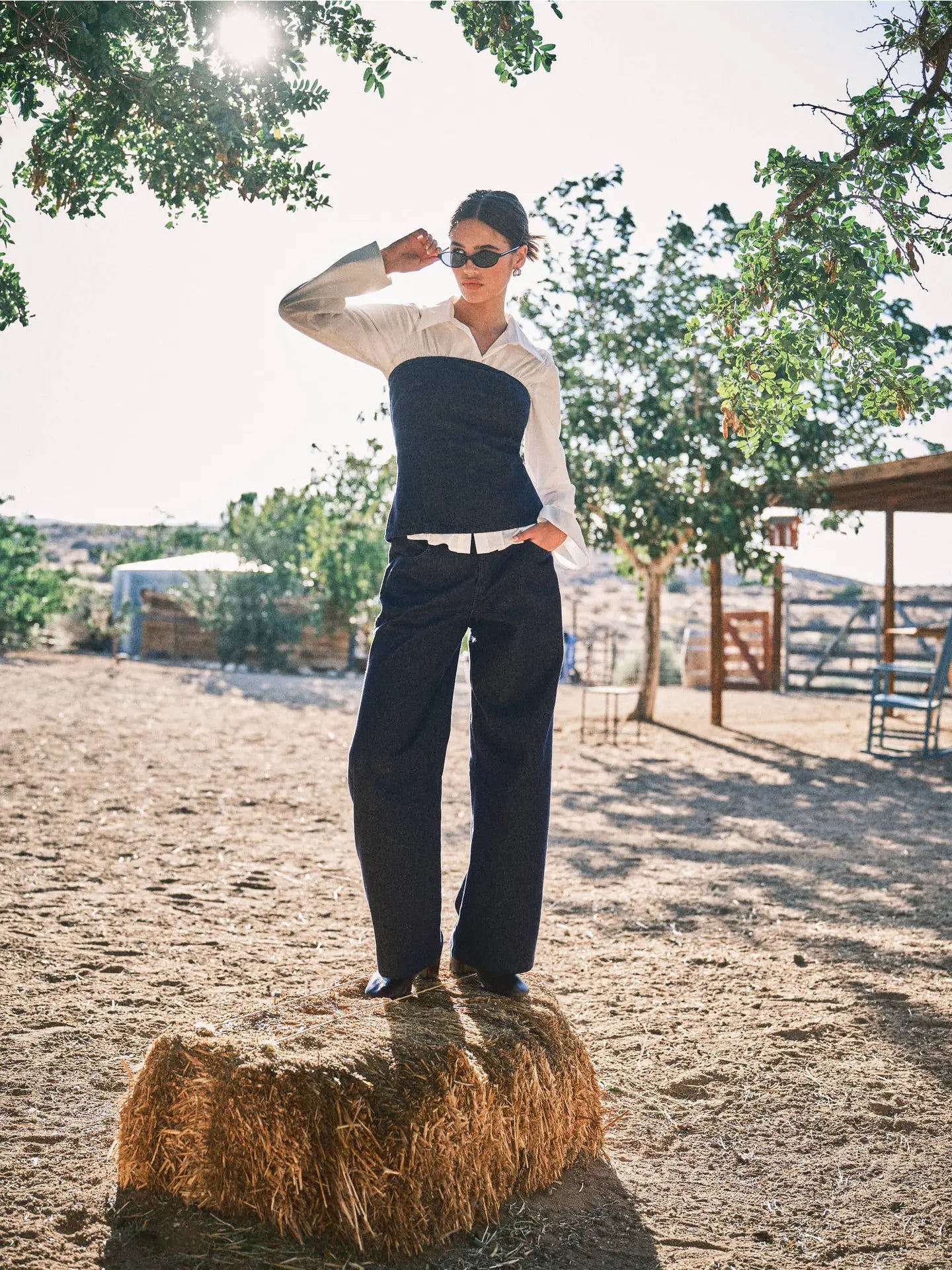 Elevate your denim game with these dark washed denim pants. These structured pants are made from durable dark-wash denim and feature a classic button and fly zip closure, functional pockets, and belt loops. A unique adjustable belt at the back adds a customizable fit and subtle edge. Style them with the matching top for a sleek, coordinated look. - Dark denim fabric for a clean, versatile look - Button + fly zip front and belt loops for a classic finish - Adjustable belt detail at back for a customizable fit - Pockets for everyday functionality - Pairs perfectly with matching top
