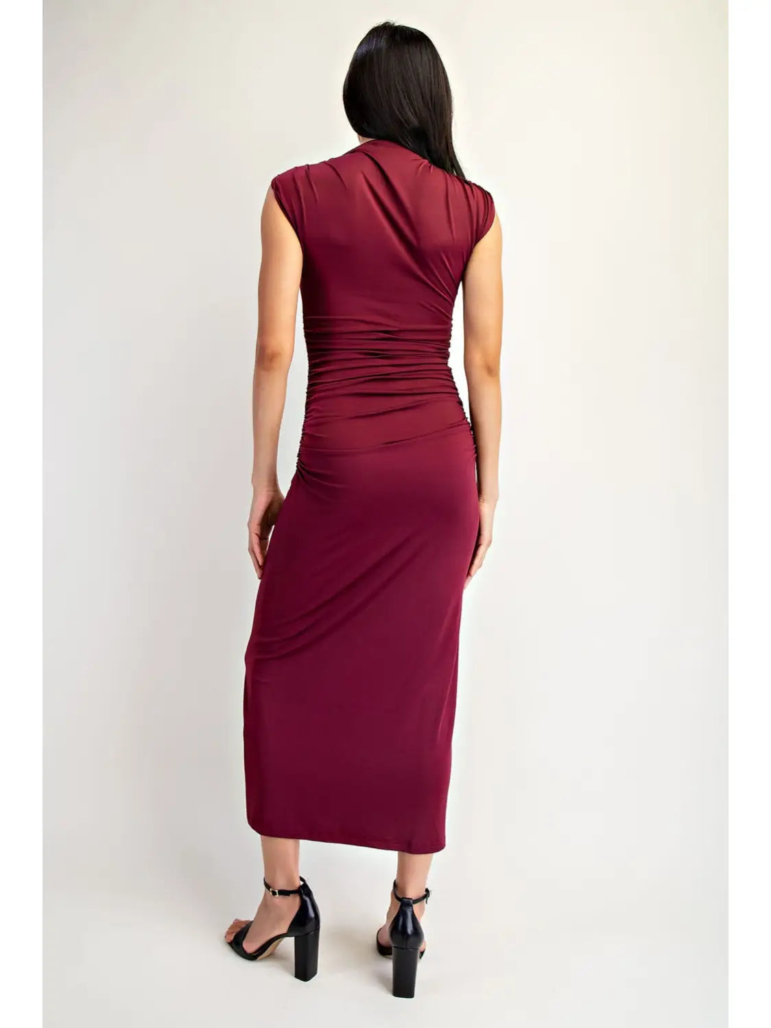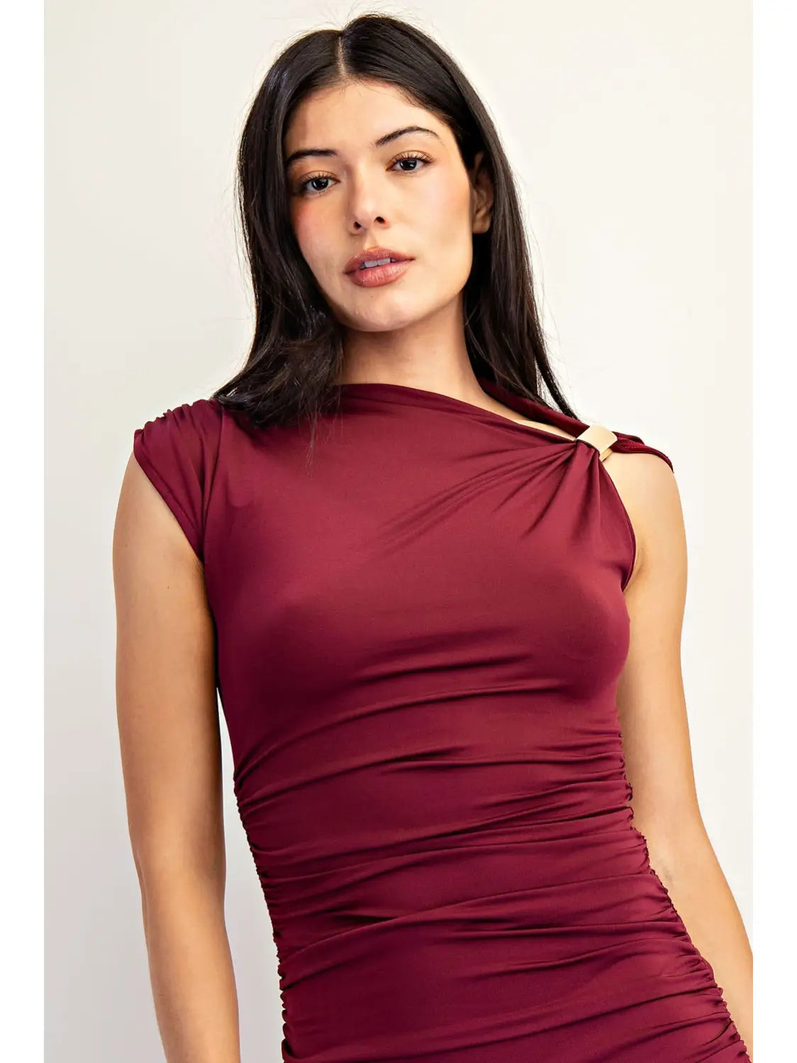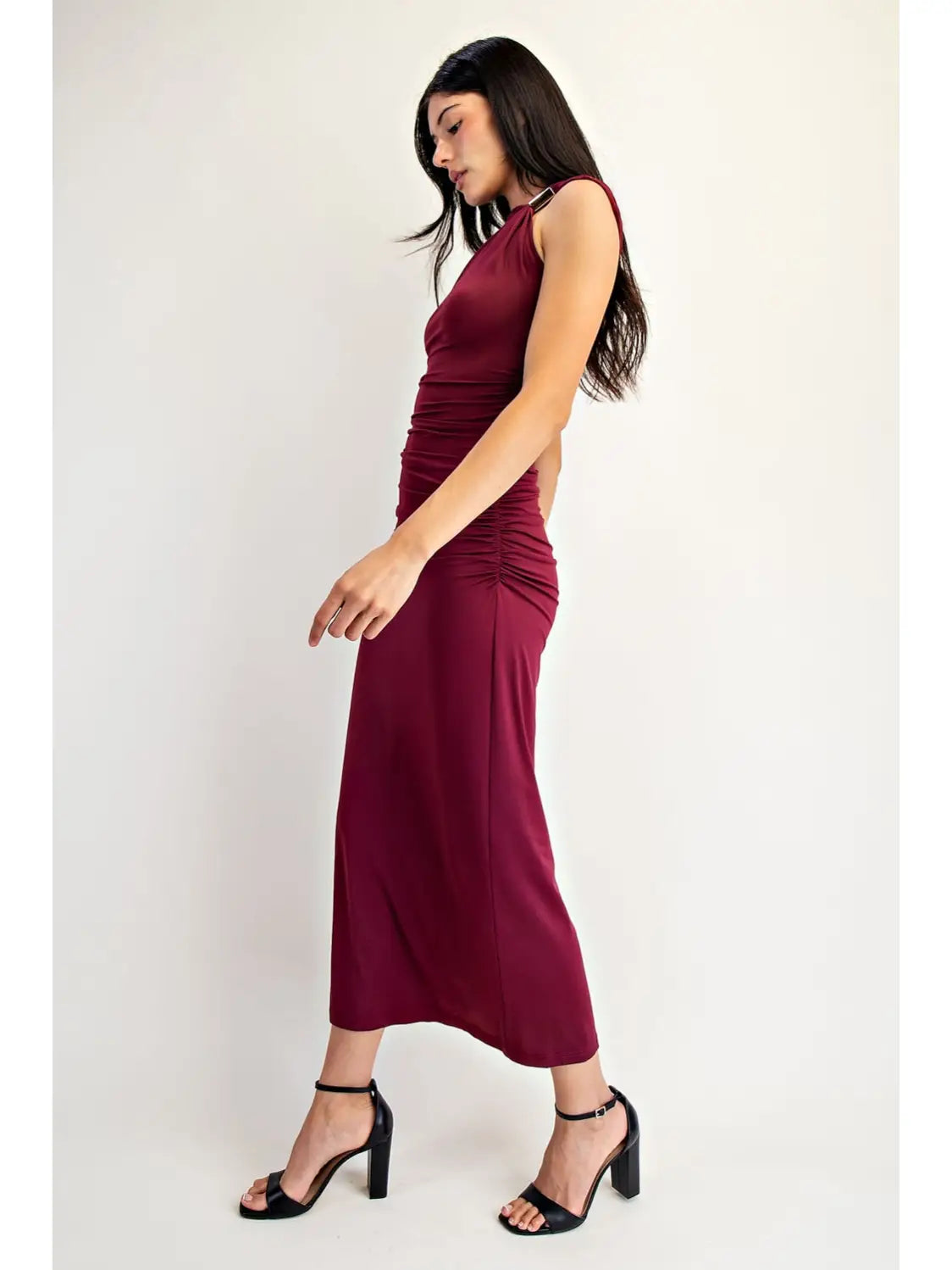 Turn heads in this sleek and sultry ruched midi dress, designed to sculpt and flatter. This elegant piece features a unique asymmetric neckline with a gold-tone metal ring strap on one shoulder, adding a modern edge. The stretch fabric offers a body-contouring fit, while ruched sides enhance your silhouette. Perfect for upscale evenings, formal parties, or a night out. - Midi Dress - Asymmetric Neckline - Metal Ring Accent - Body-Hugging Silhouette - Sleeveless - Ruched Sides