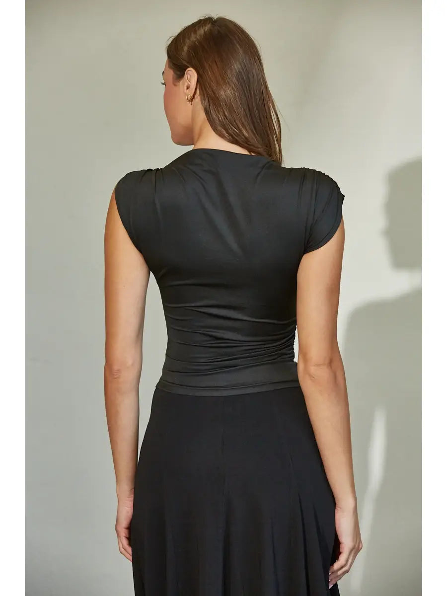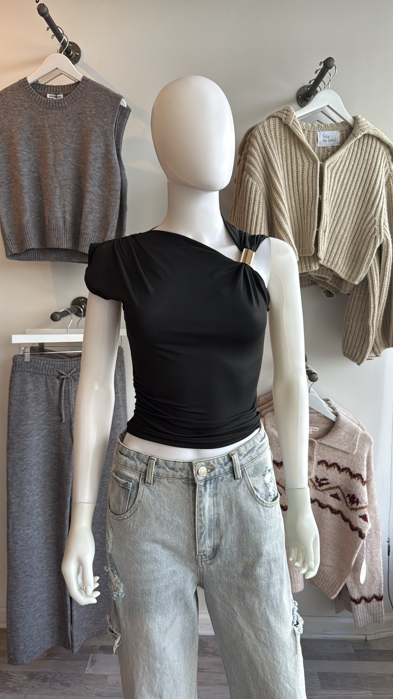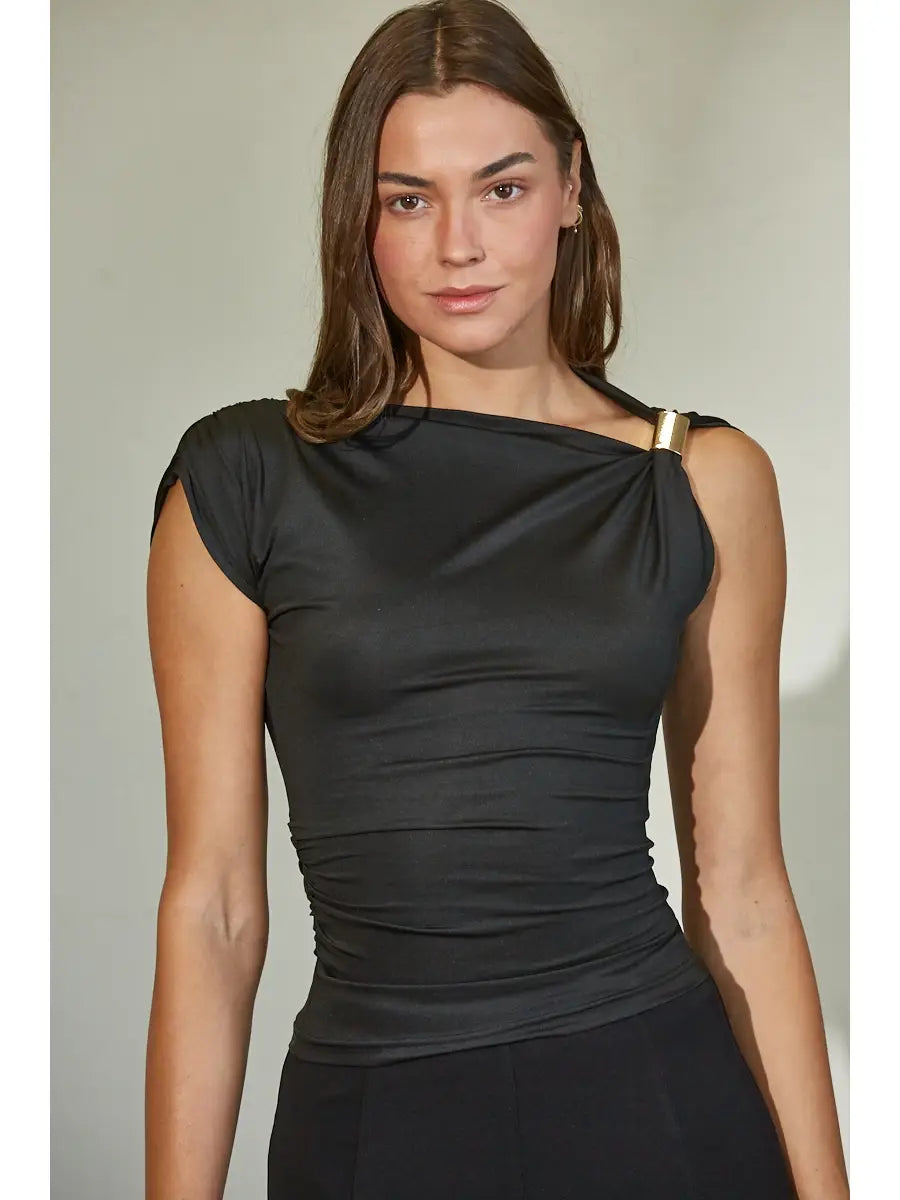 Sleek and sculpted, this asymmetrical ruched top features a standout gold-tone hardware accent on one shoulder for a modern twist. Crafted from a smooth, body-hugging stretch fabric, it highlights your silhouette with elegant side gathers. Perfect for night outs, cocktails, or elevated everyday looks. - Asymmetrical Top - Gold Trim Accent - Ruched Sides - Stretchy - Fitted Silhouette