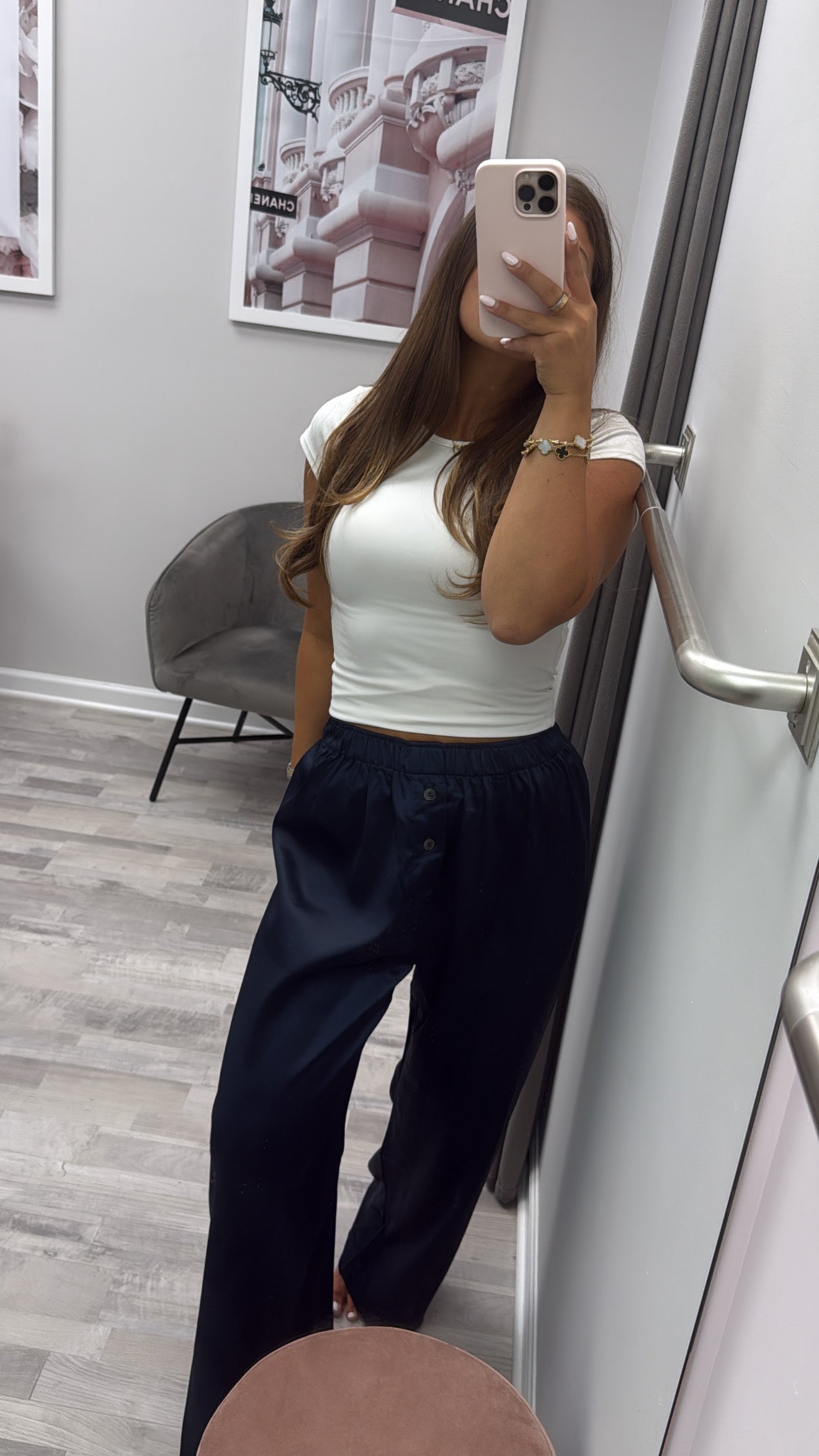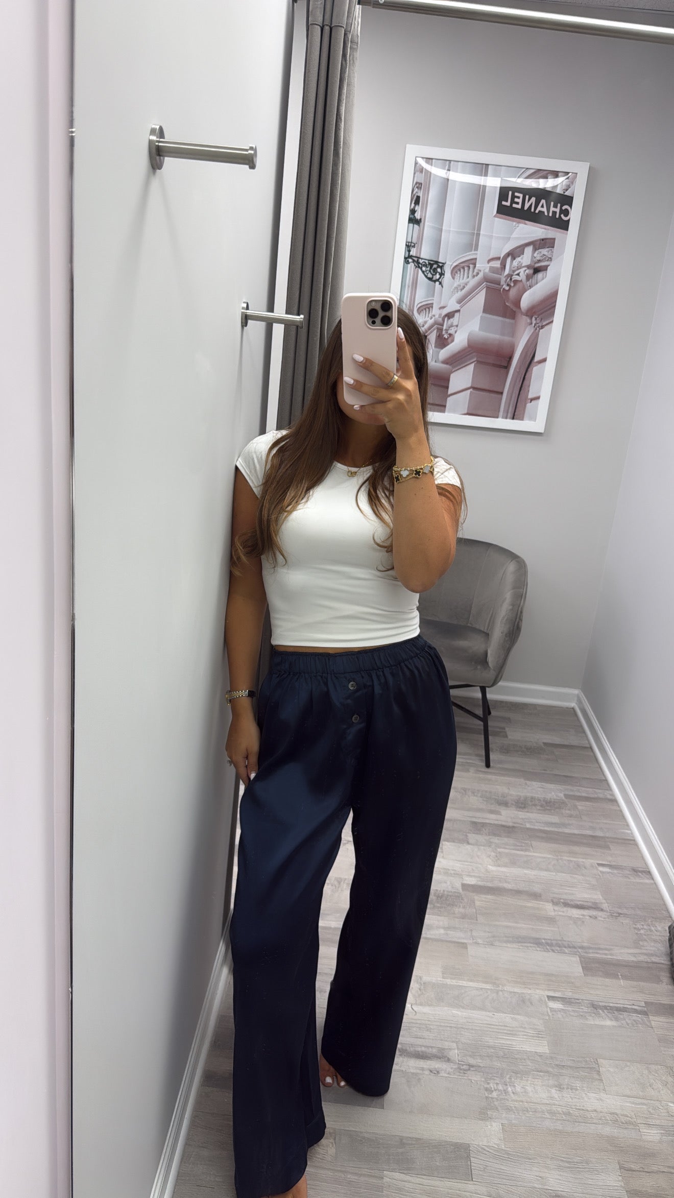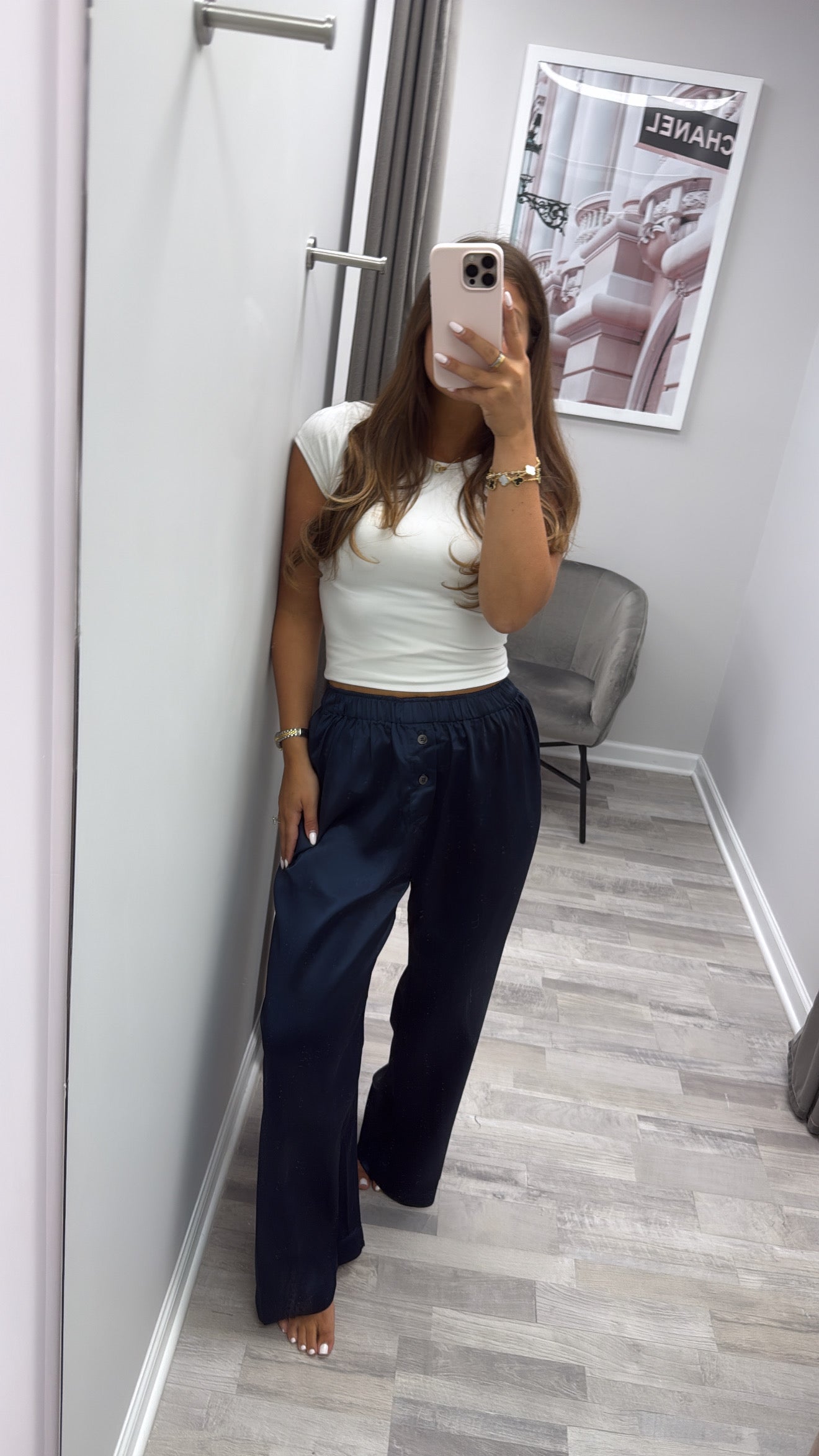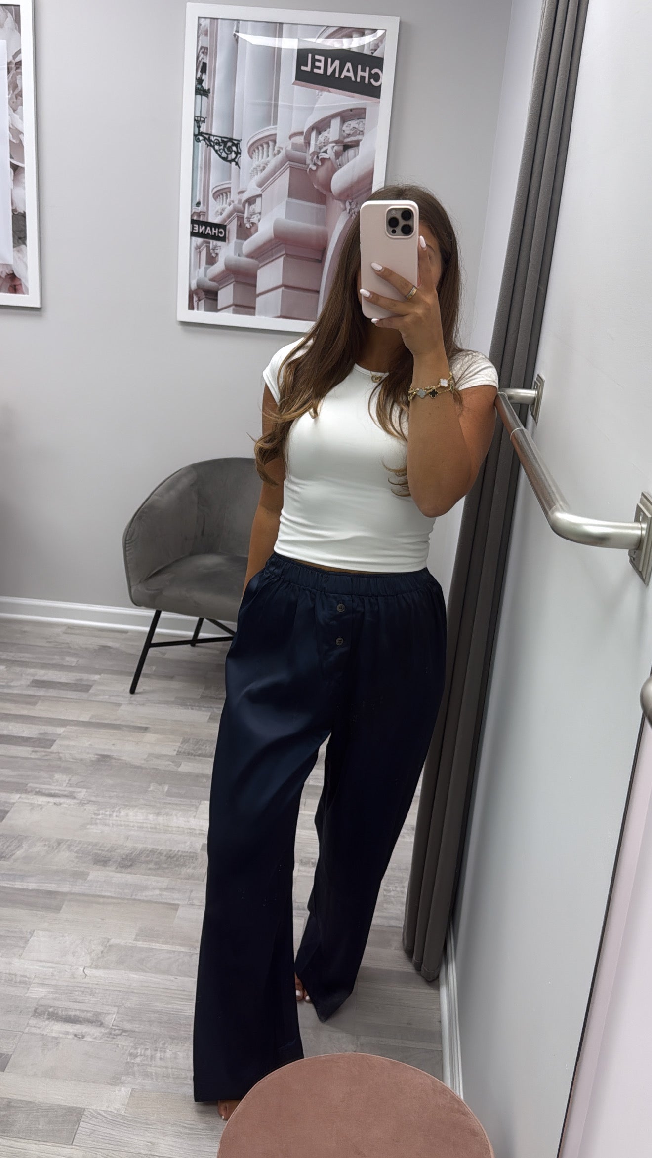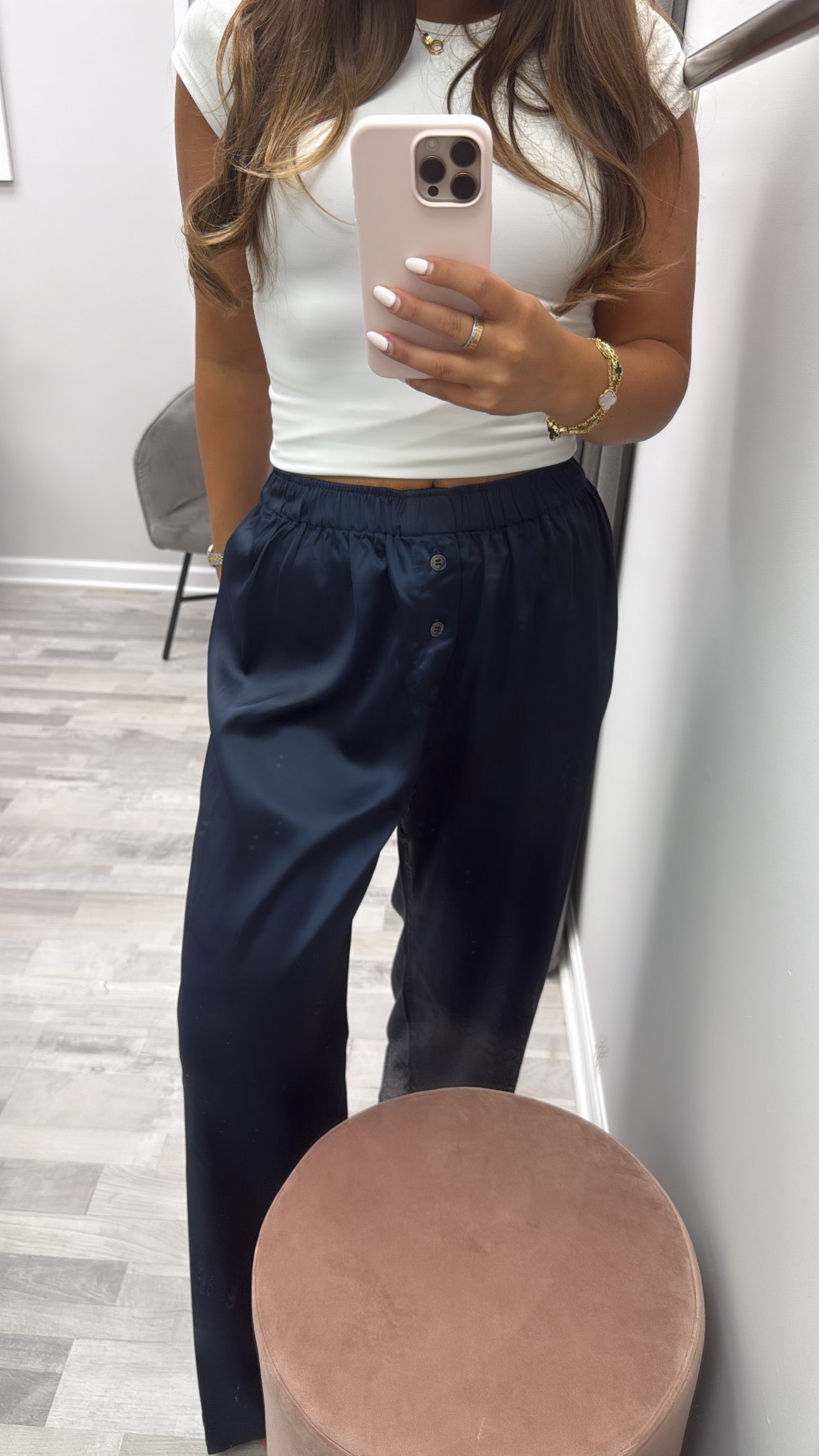 navy blue satin pull up pants features a banded waistline and a straight leg