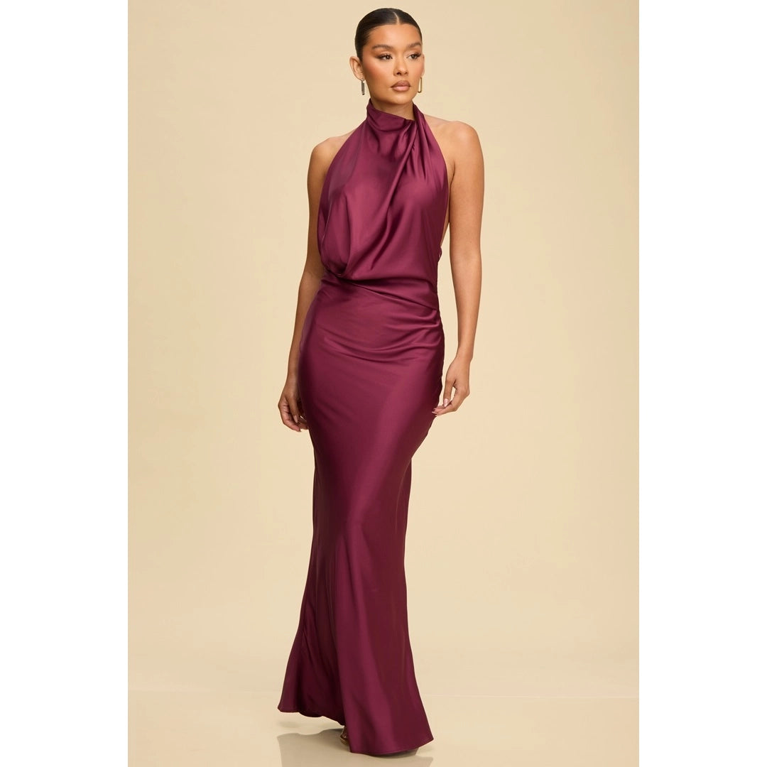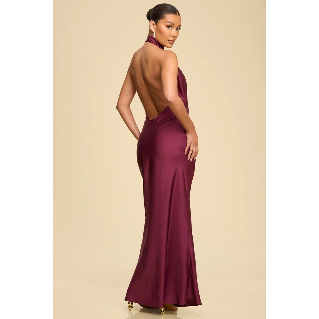 Cowl front open back satin dress