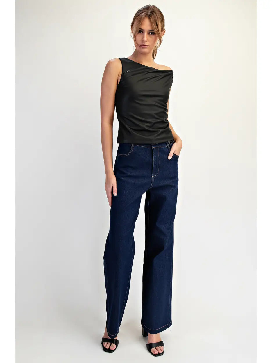 A modern, statement-making top designed with minimal lines and bold texture. Crafted from smooth faux leather, this one-shoulder silhouette features soft side ruching that flatters the figure while maintaining a sleek, sculpted appearance. The subtle sheen of the fabric gives a contemporary edge, perfect for night-out looks or dressed-up daytime outfits. Its asymmetrical neckline adds a sophisticated, fashion-forward touch that elevates any ensemble.