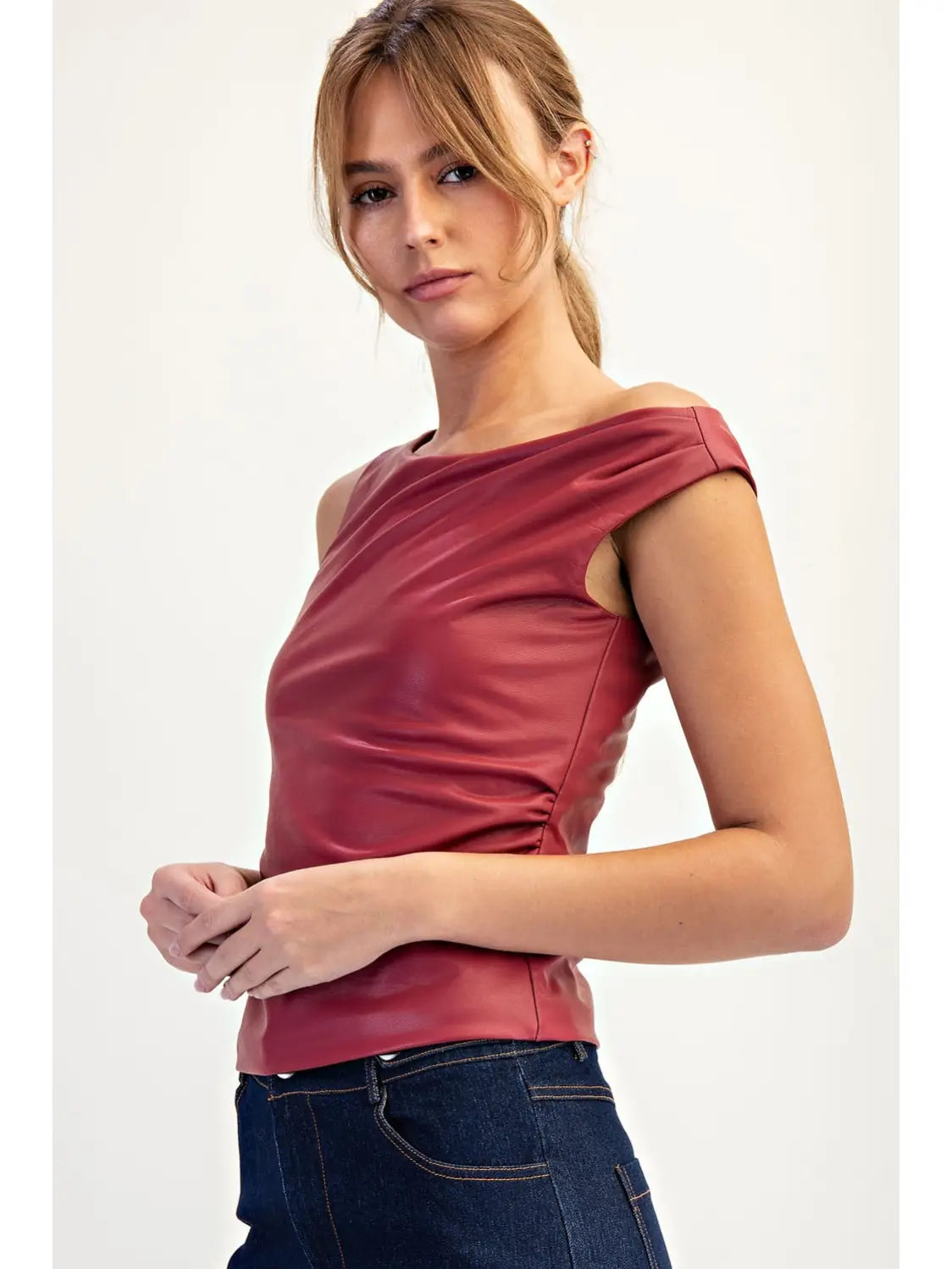 A modern, statement-making top designed with minimal lines and bold texture. Crafted from smooth faux leather, this one-shoulder silhouette features soft side ruching that flatters the figure while maintaining a sleek, sculpted appearance. The subtle sheen of the fabric gives a contemporary edge, perfect for night-out looks or dressed-up daytime outfits. Its asymmetrical neckline adds a sophisticated, fashion-forward touch that elevates any ensemble.