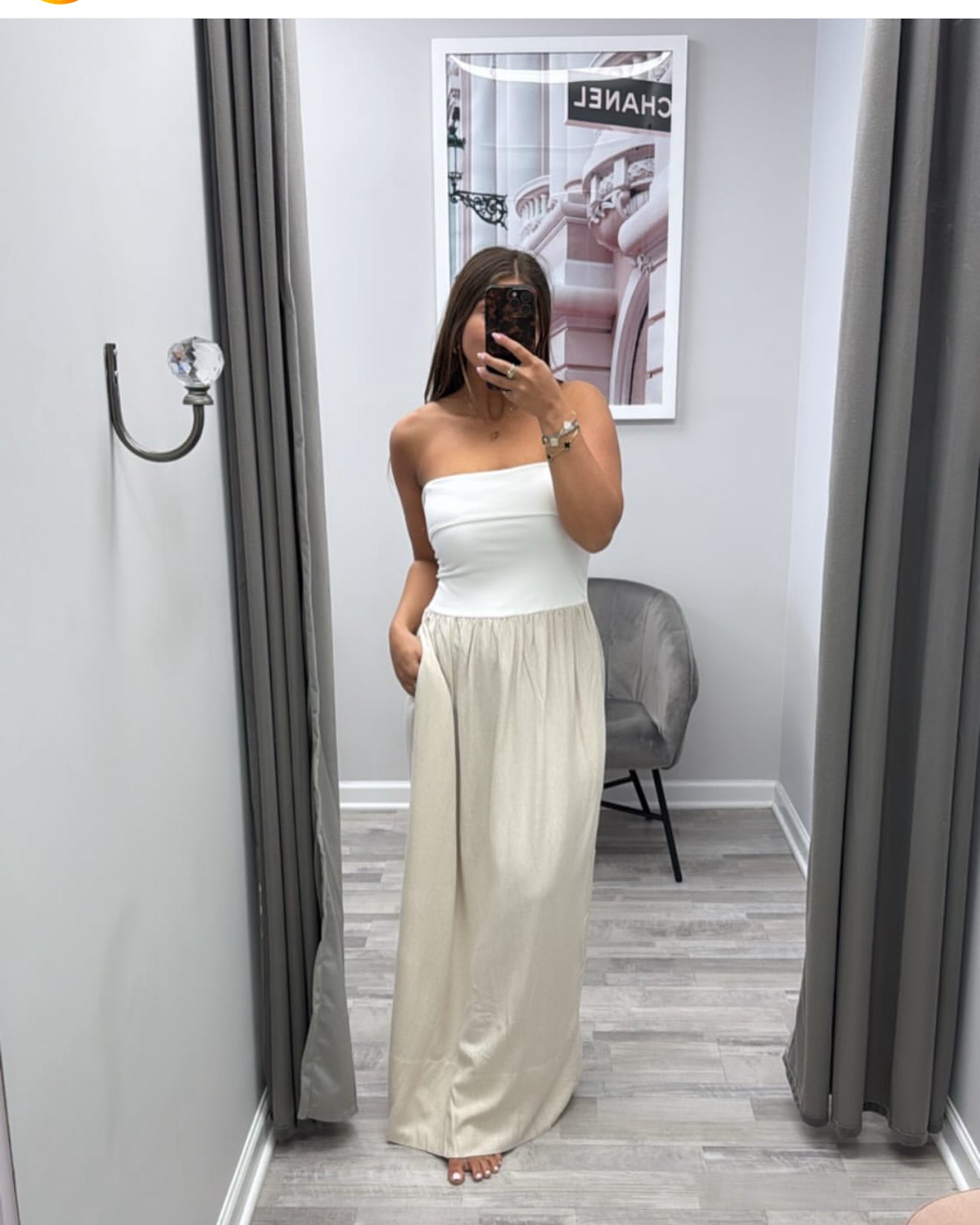 white and oatmeal maxi dress with side pockets