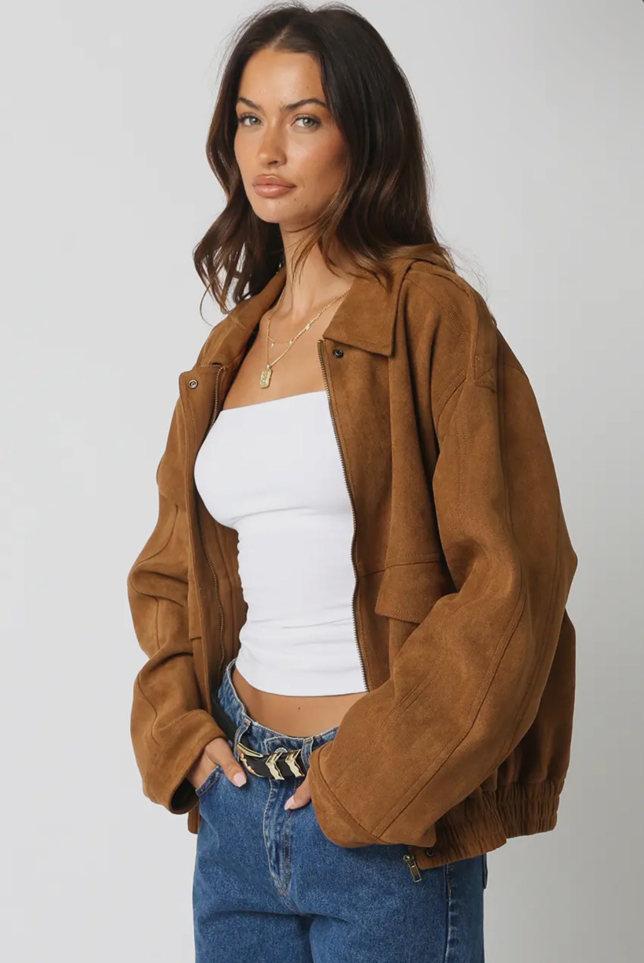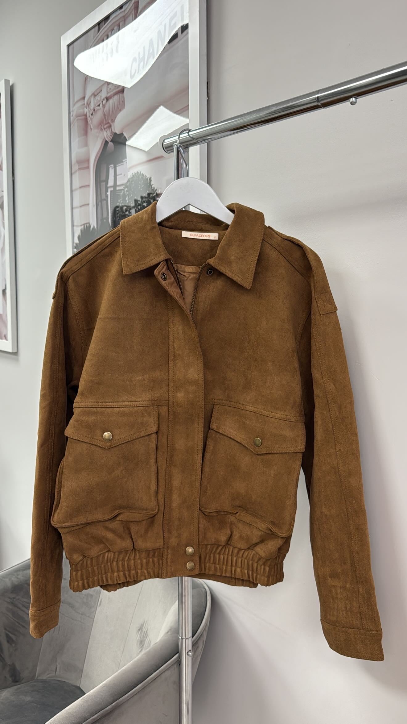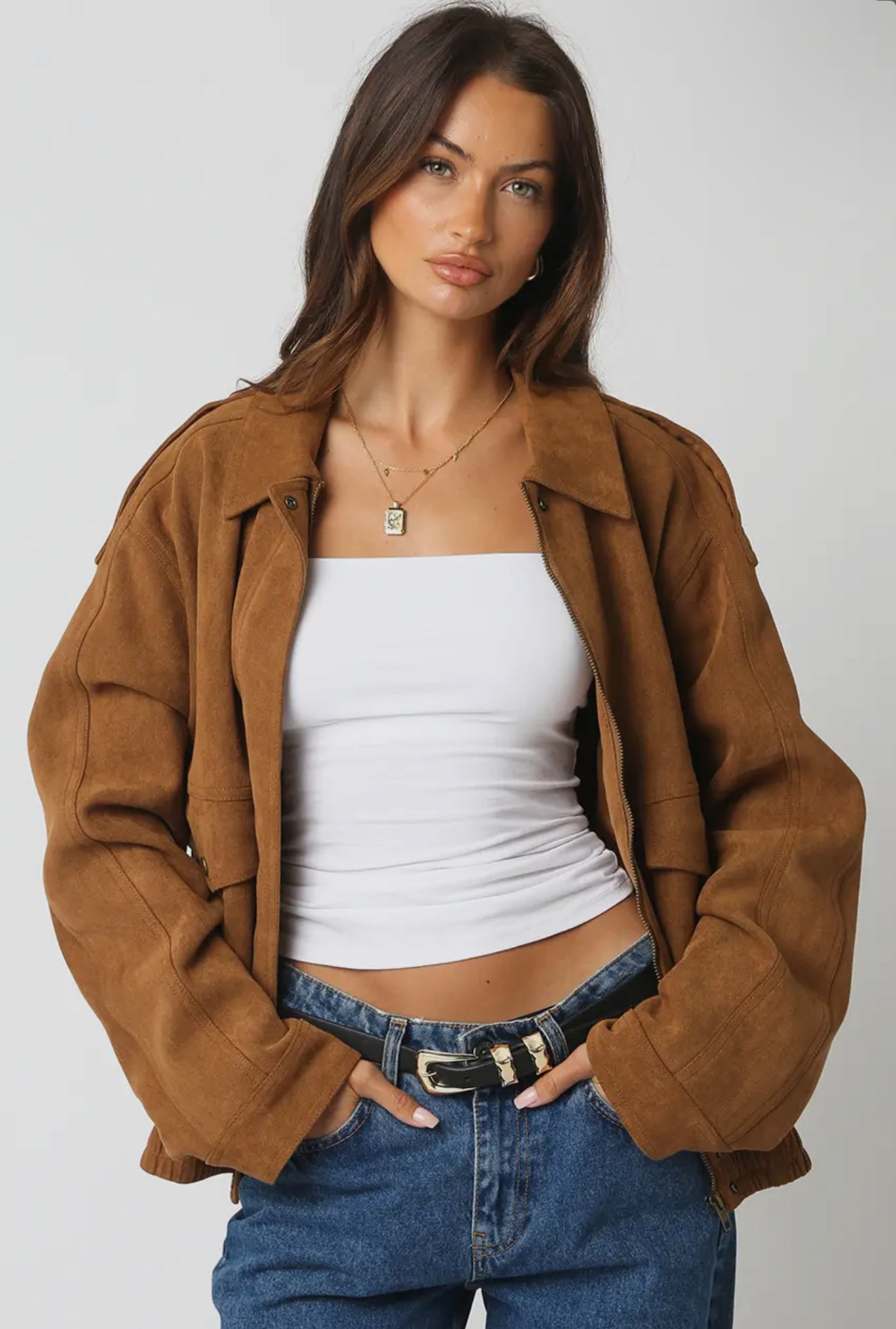 soft faux suede fabric with a smooth, luxe texture and a relaxed fit with dropped shoulders and pockets
