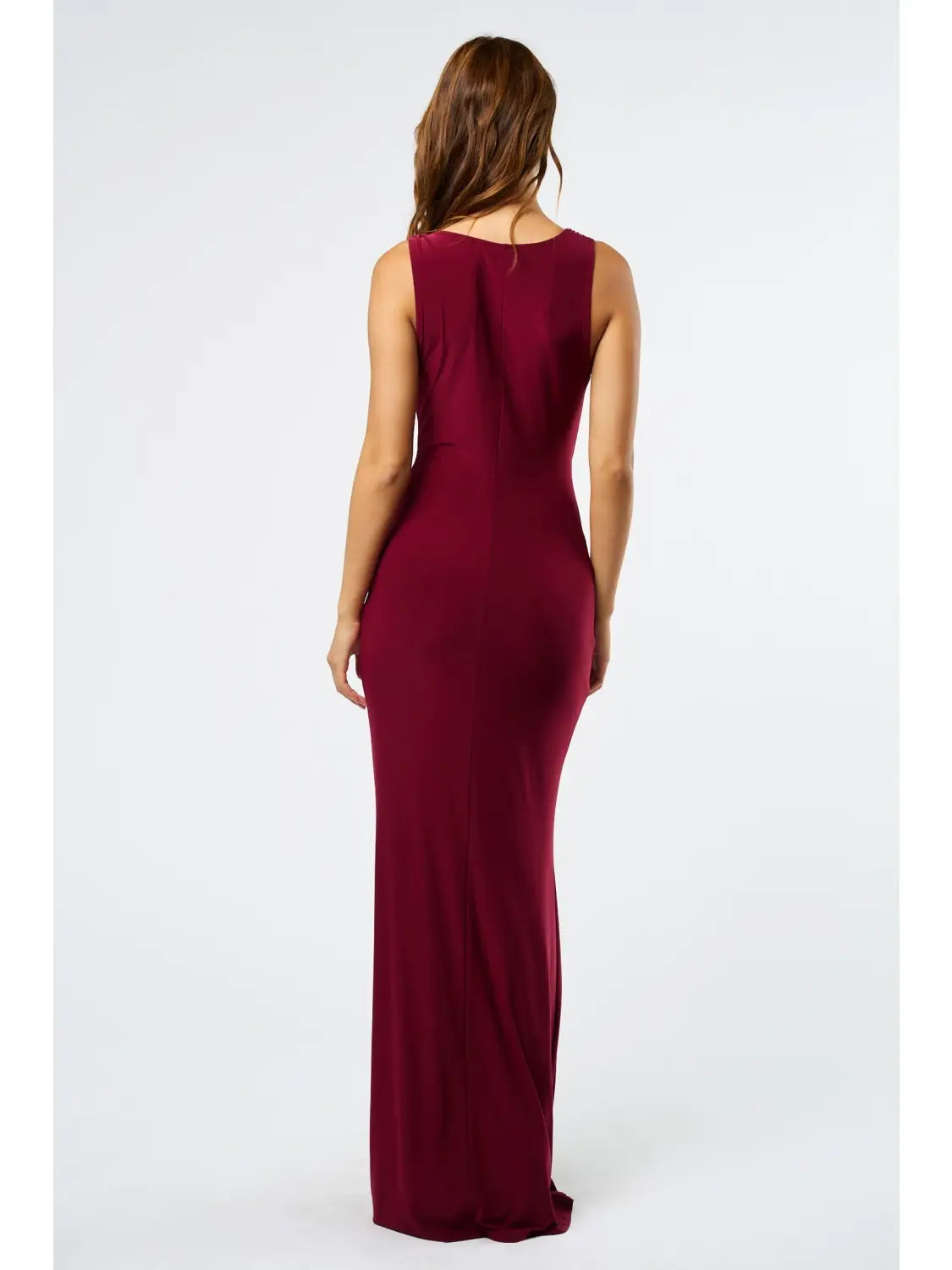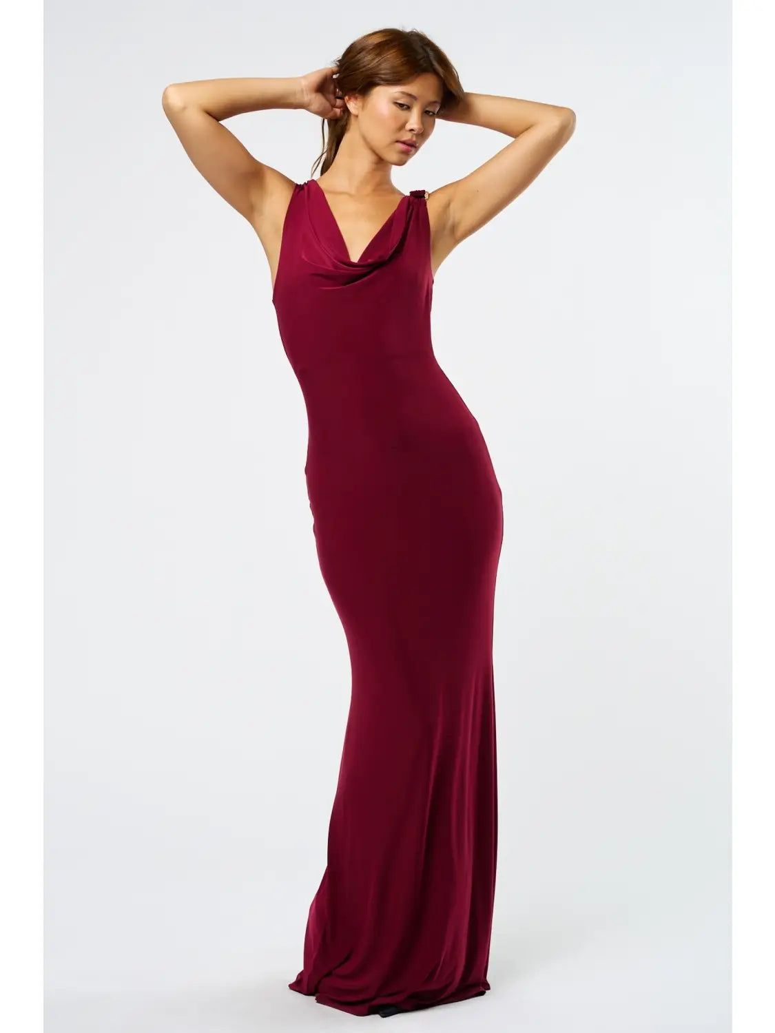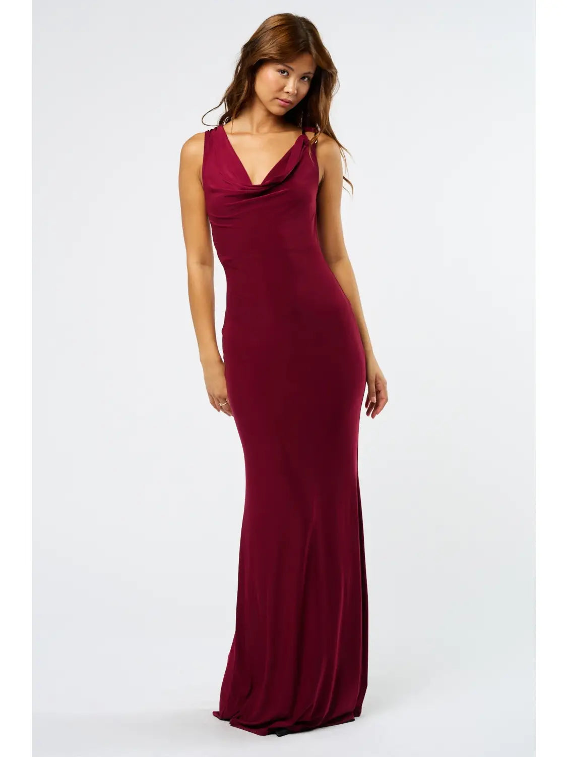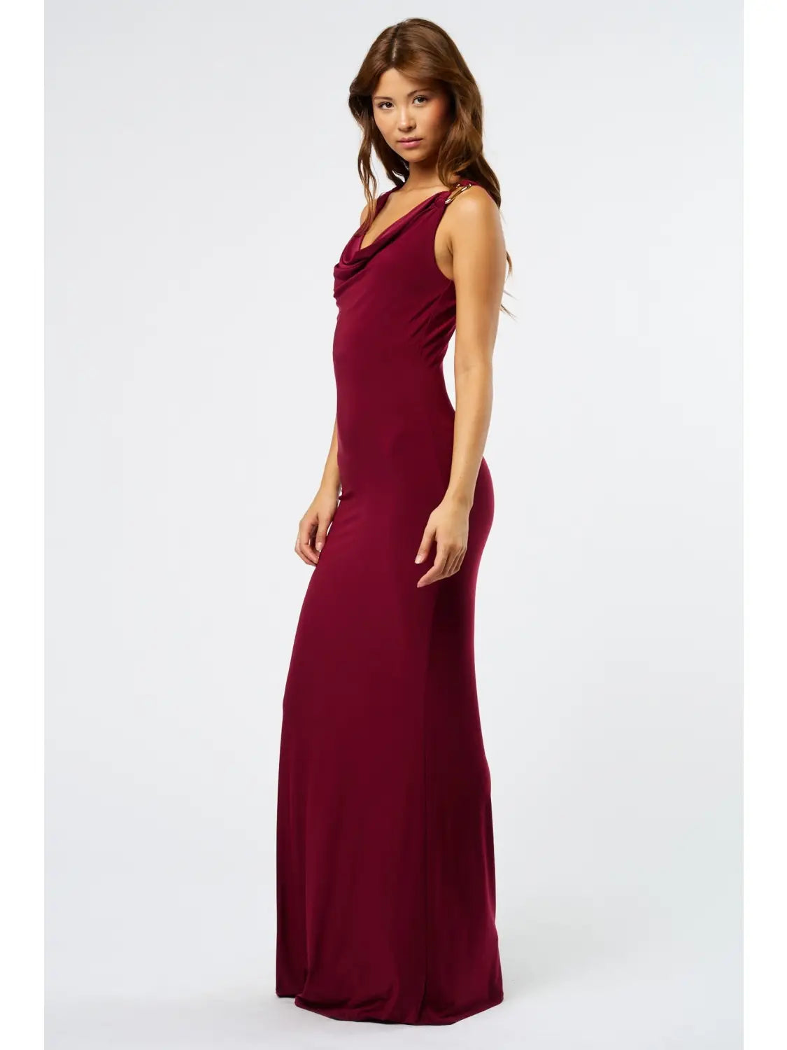 Sophisticated and timeless, this cowl neck maxi dress features delicate trim detailing that elevates its sleek silhouette. Crafted from a smooth, flowing fabric, it drapes beautifully for an effortlessly refined look.