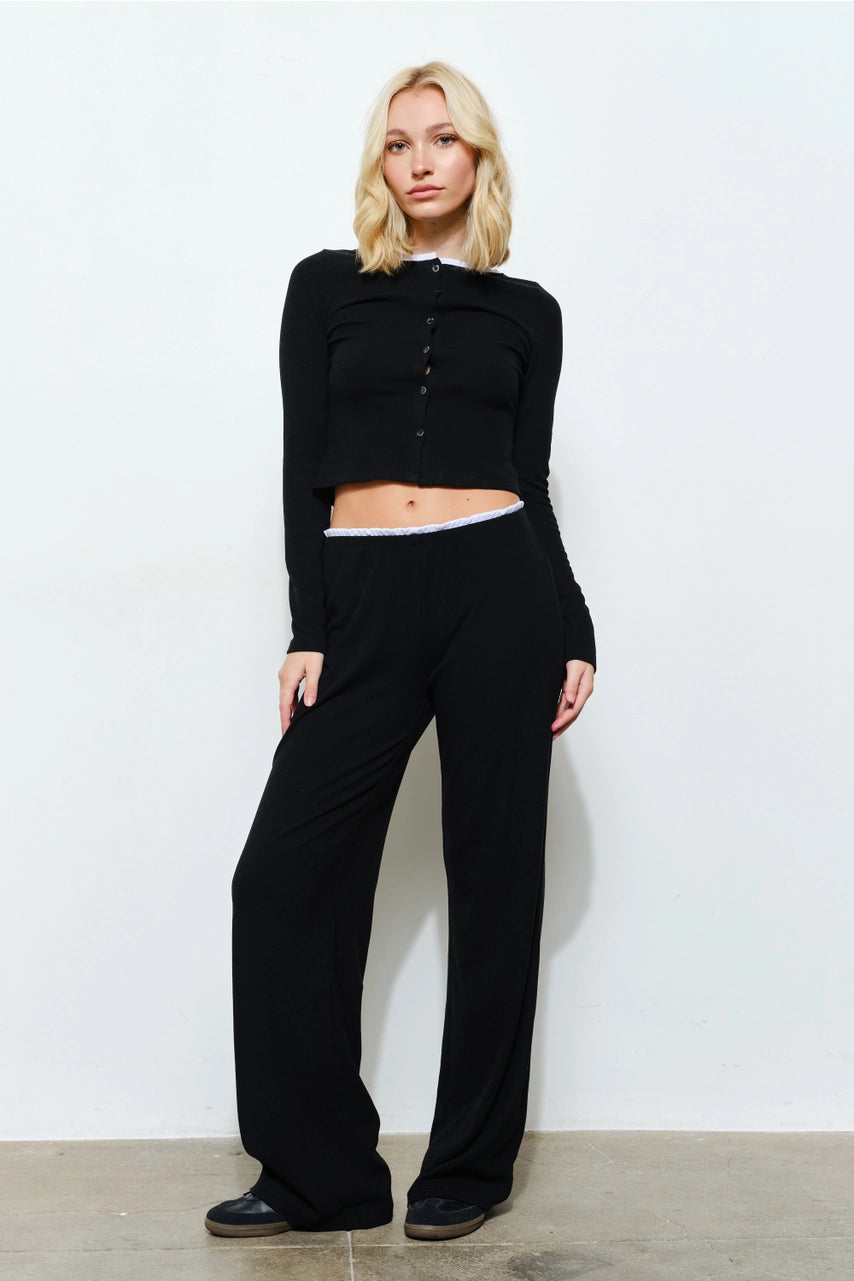 Meet the one that got away top. Crafted from soft, stretchy ribbed knit, it features a flattering front button closure, playful contrast hem for extra pop, and long sleeves for year-round wear. Pair it with the matching ribbed pants for an effortlessly coordinated look that's perfect for lounging at home or stepping out in style.
