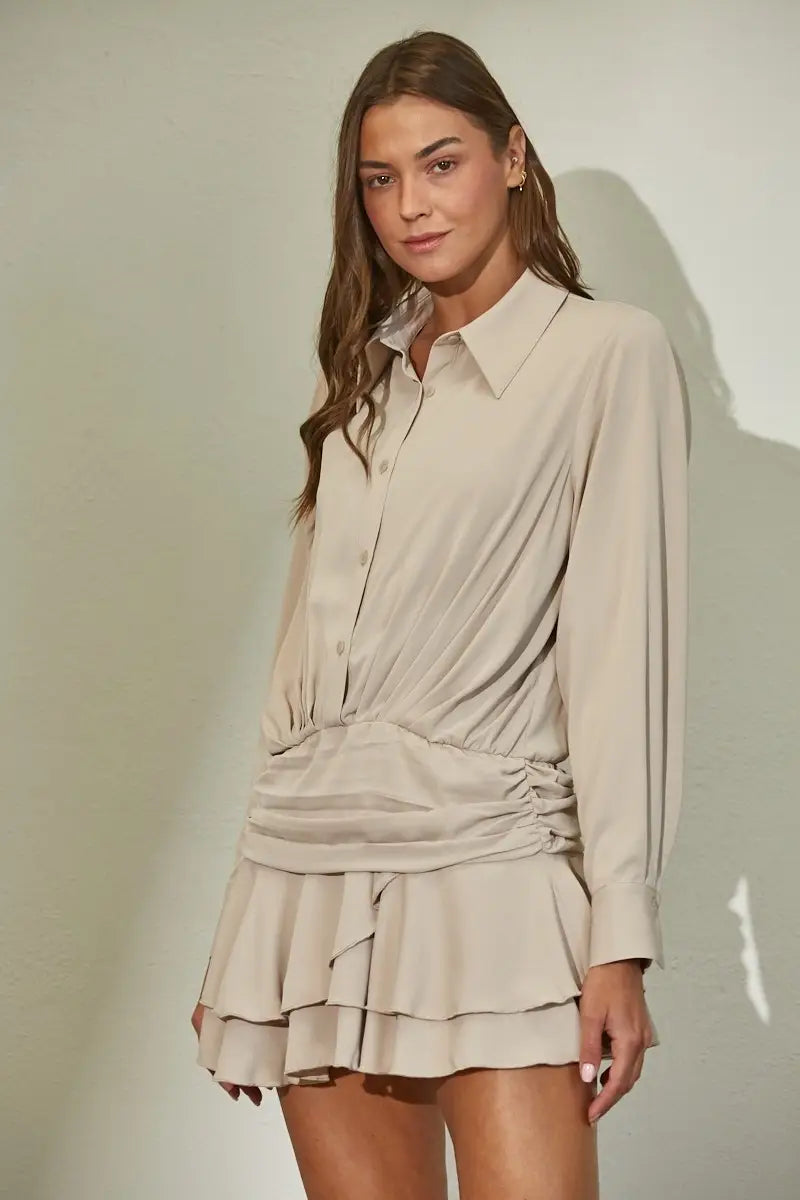 This stylish mini shirt dress features a refined collared neckline and long sleeves with button cuffs for a polished, tailored look. The ruched waistline enhances your shape, while the double-tiered ruffle hem adds a playful and feminine touch. Crafted in a soft, lightweight fabric, this solid-colored dress is ideal for both casual outings and elevated daywear.