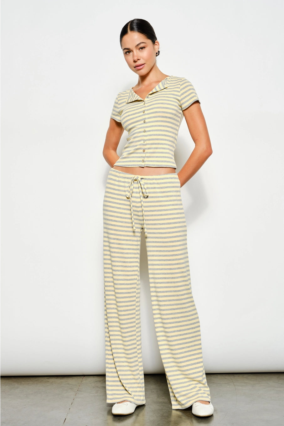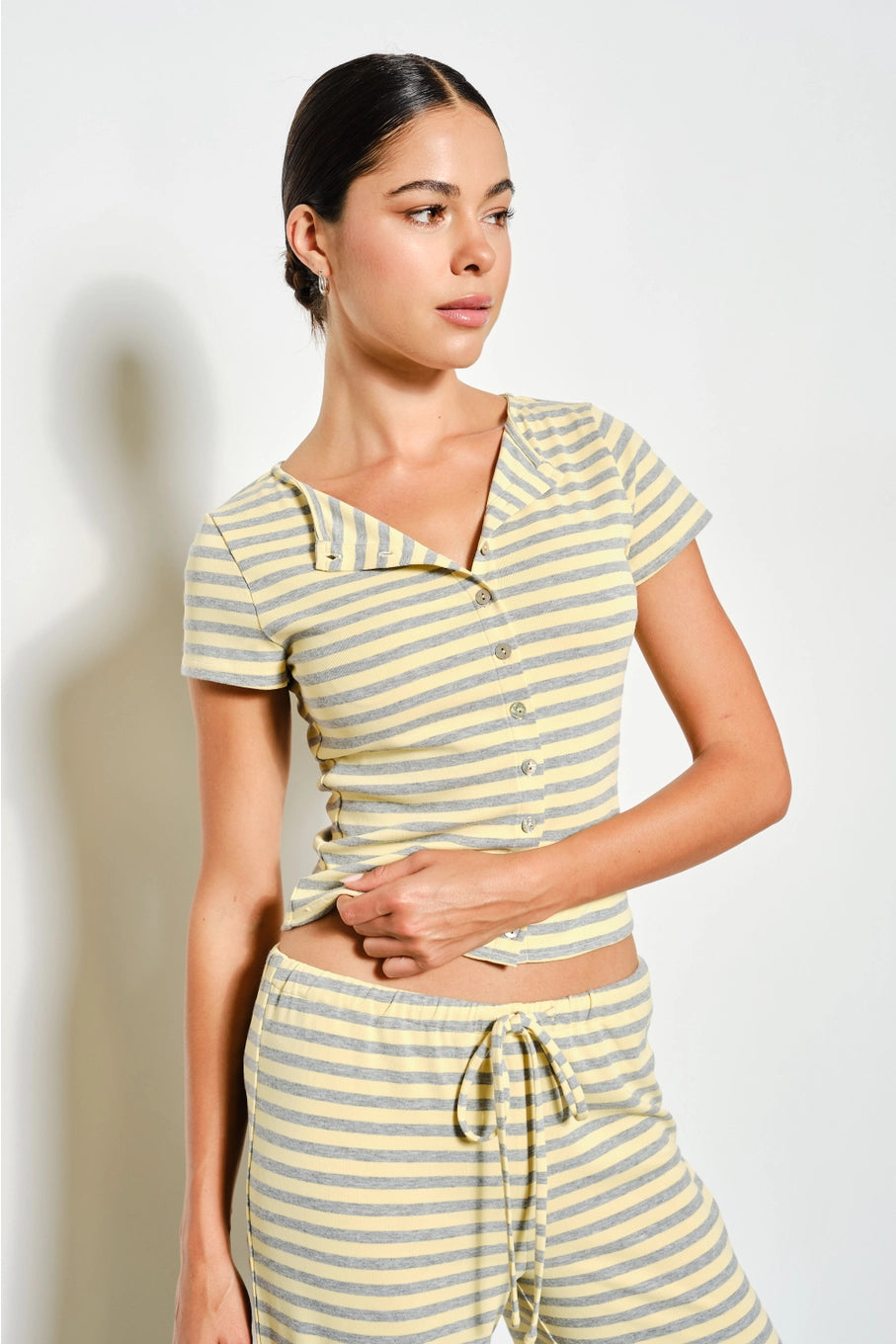 Add a pop of playful stripes to your look with our striped Top. This fun, easygoing piece features a front button closure and short sleeves, blending comfort with bold style. Pair with the matching pants PCP1266 for an effortlessly coordinated outfit or wear solo for a statement-making vibe.
