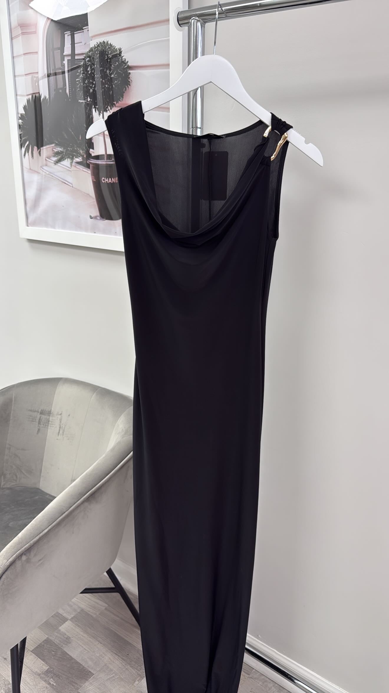 Sophisticated and timeless, this cowl neck maxi dress features delicate trim detailing that elevates its sleek silhouette. Crafted from a smooth, flowing fabric, it drapes beautifully for an effortlessly refined look.