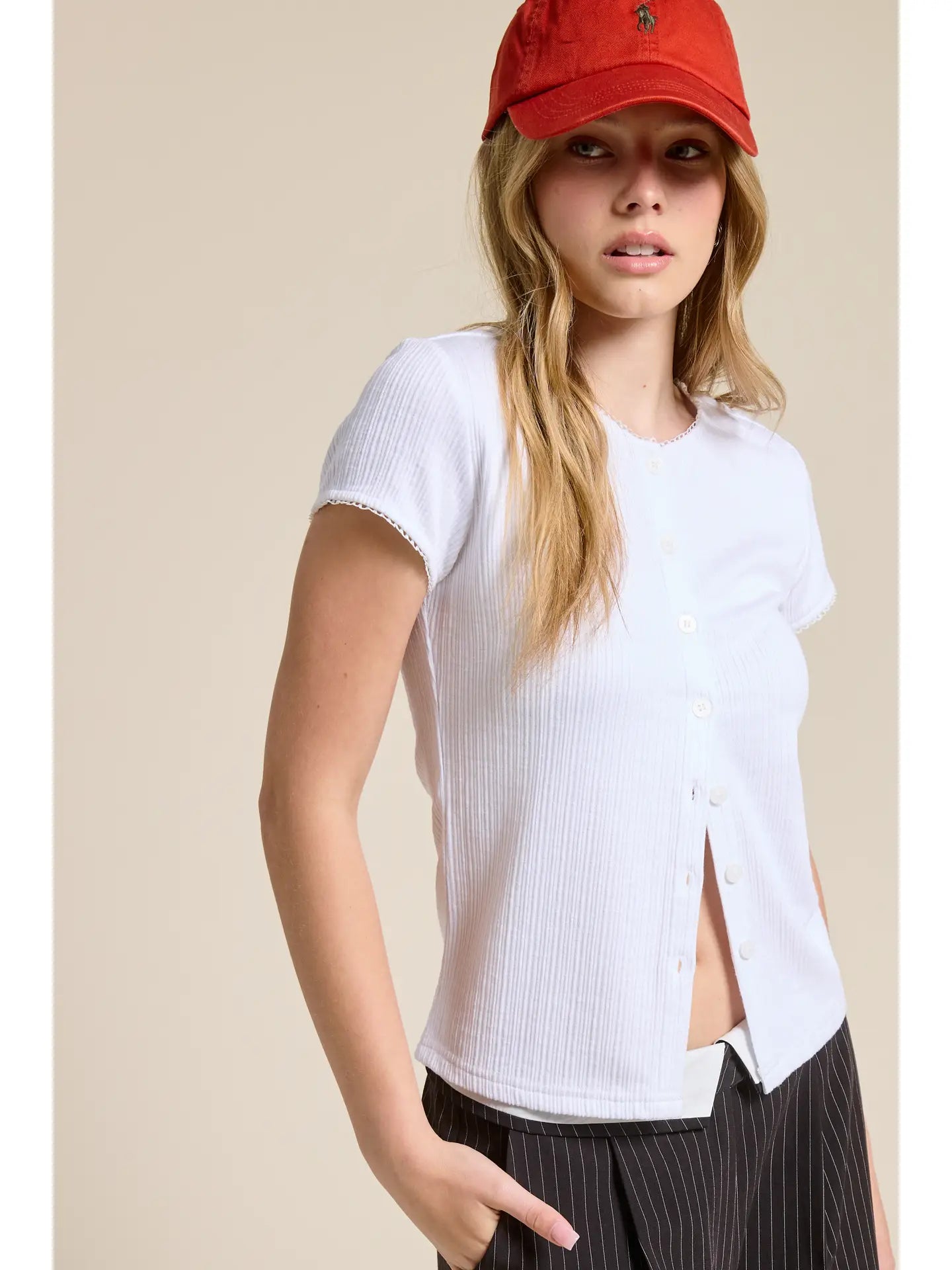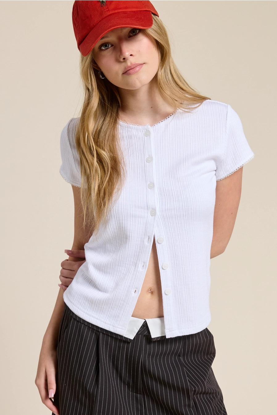 A fresh take on a timeless essential, this ribbed short-sleeve top features a fitted silhouette with stretch for all-day comfort. The button-down front and round neckline are softened with delicate scalloped trim, while a subtle front hem slit adds styling versatility. Whether tucked into high-rise denim or worn loose with low-waisted bottoms, this piece brings a touch of charm to everyday dressing.